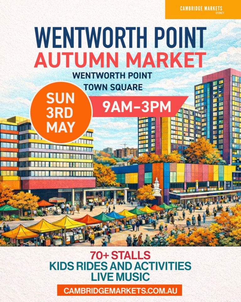 Join the Wentworth Point Autumn Market on Sunday 3 May, 9am–3pm at Town Square. 70+ stalls, kids rides, live music and local…